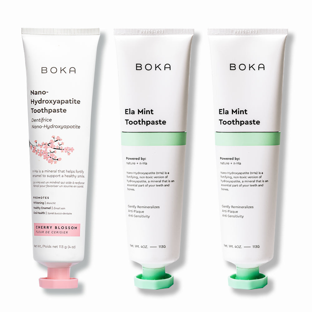 The brighter, the better! Jump into springtime with three n-Ha toothpastes (or split them up and keep one for yourself) with this bright blossom bundle, featuring one limited-edition Cherry Blossom Cream flavor and two additional flavors of your choice. Our power-packed n-Ha Toothpastes trade fluoride for nano-hydroxyapatite (n-Ha), remineralizing and fortifying teeth with every brush. n-Ha freshens breath (for those mistletoe moments…), whitens teeth, and works to close holes on enamel that can cause tooth sensitivity.