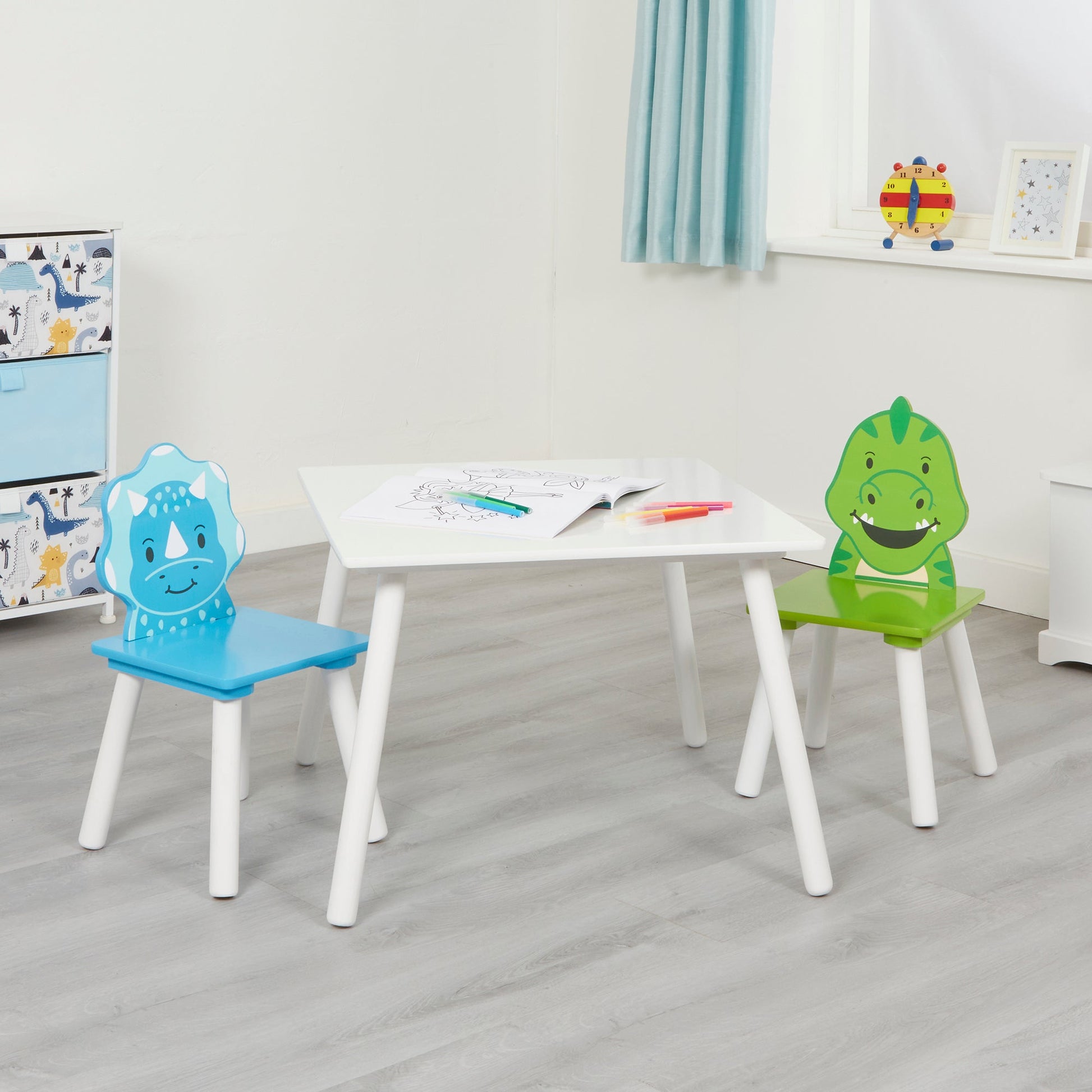 Children's Dinosaur Wood Table and 2 Chairs Set | White, Blue & Green | 2 Years +