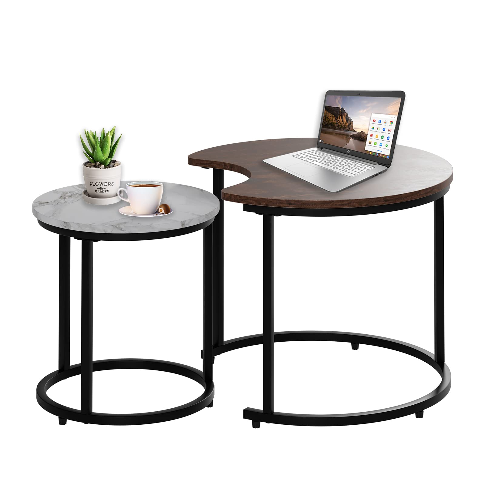 - UNIQUE MOON STYLE: Coffee center table combination of vintage brown wood grain tabletop and elegant white marble tabletop ,Especially the crescent moon nesting tables shape after upgrading is elegant and minimalist is unique in the market. Great coffee tables for living room, bedroom, office, apartment, etc.