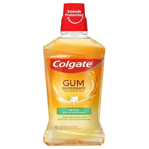 Product Description Colgate Gum Invigorate Revitalise Mouthwash 500ml Colgate Gum Invigorate Revitalise mouthwash contains gingseng extract, helps prevent gum problems, and fights the main cause of gum irritation - bacteria along the gum line - to progressively build strength day after day. Zero alcohol** **This formula does not contain ethyl alcohol Builds lasting gum strength* Delivers 24/7 plaque protection* *with continued twice daily use. Ingredients Aqua, Glycerin, Propylene Glycol, Sorbitol, Poloxamer 407, Aroma, Cetylpyridinium Chloride, Potassium Sorbate, Sodium Fluoride, Menthol, Sodium Saccharin, Citric Acid, Sucralose, Propolis Extract, Panax Ginseng Root Extract, CI 15985, CI 16035, Contains: Sodium Fluoride (225 ppm F¯) Safety Warning Do not swallow. Not for use by children under 6 years. Keep out of reach of children.