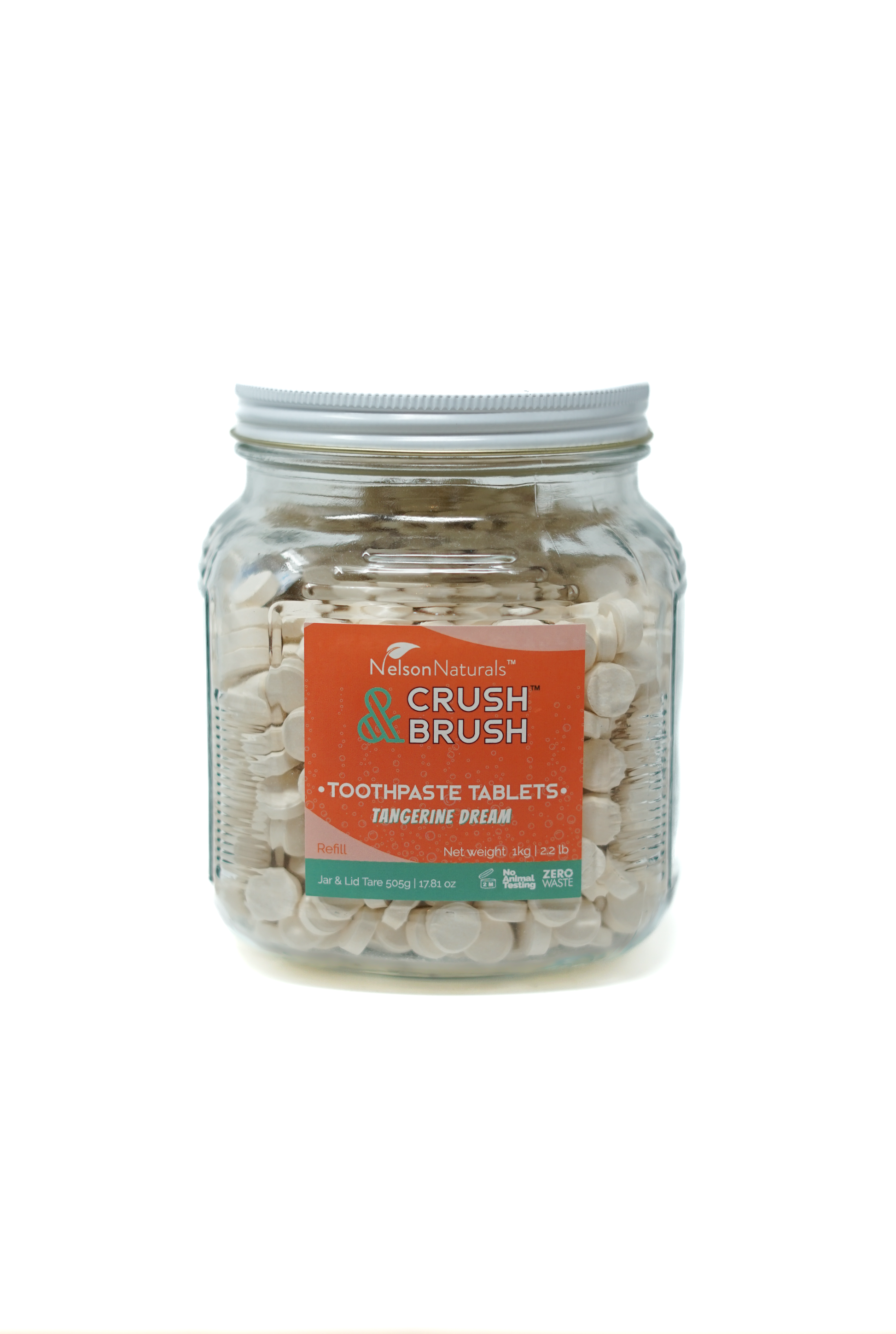 The initial order of bulk Crush & Brush will come in the new Anchor Hocking glass jars and subsequent tablet orders will come in compostable bags that can be used to refill the jar.