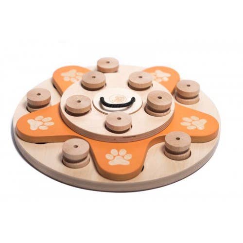 Dog's Flower is our another design in disk-shaped puzzles line that aims to raise curiosity of your pet with circular object. Ten cylinders placed inside of two levels of wooden platforms require first removal of them from their designated spaces. Then the dog needs to spin flower-shaped platform in order to get to more treats awaiting him underneath. The parent can regulate the difficulty level from 1 paw to 4 paws by adding or subtracting the cylinders. May this "flower" brighten every day of your dog's life!
