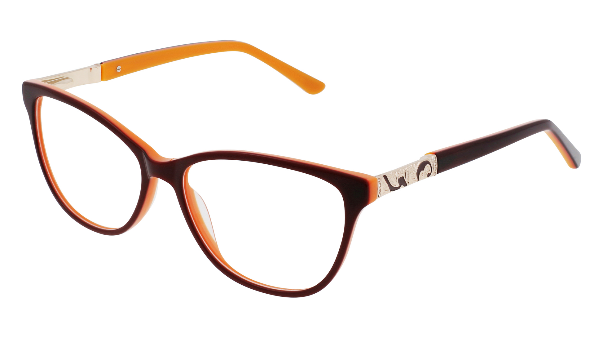- Rosa is bright and funky in an orange/red sunset colorway with gold metal tooling at the temples and a stylish cat eye shape. This feminine frame is full of personality and makes a statement.