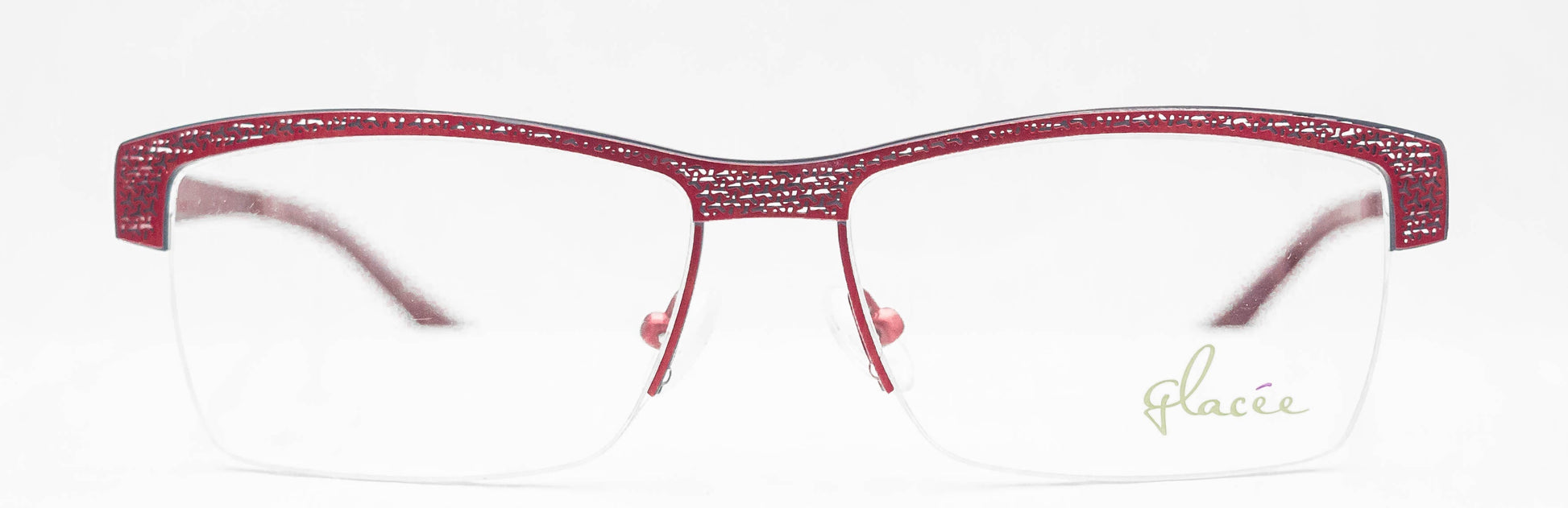Hodge podge of laser cut pattern, the?Glacee 6818?optical eyewear has arrived. Alive with color, the cleanly cut top half and temple of this frame plays with a free form array of complimenting hues and blends. With an accented hinge piece that pops through the colorful display, the Glacee 6818 will never go unseen.
