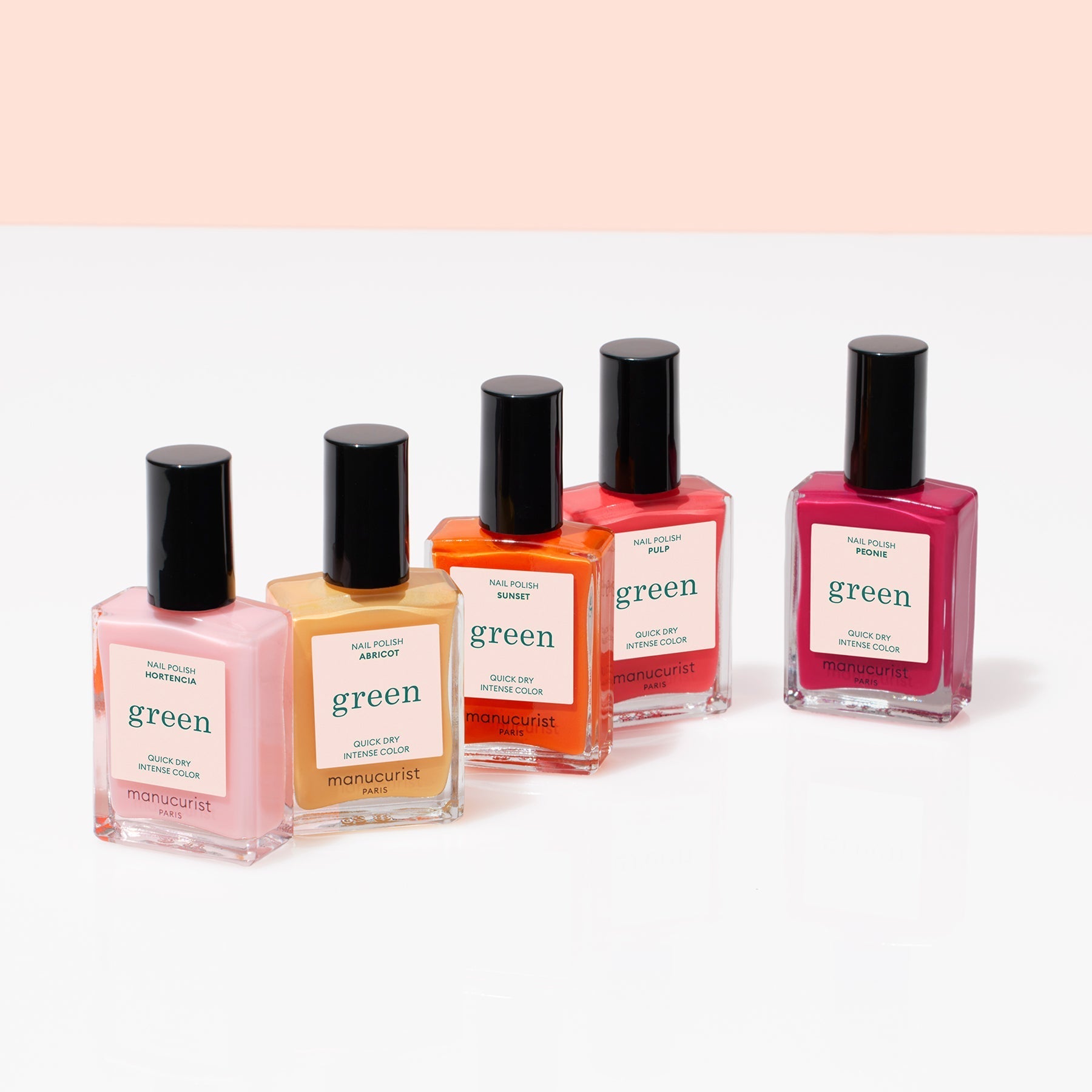 A rainbow of 5 limited-edition Green? nail polishes for spring/summer 2024! A tropical blend of colors inspired by Hawaiian Hibiscus blooms. A famous flower, highly regarded in Hawaiian culture, and symbolic of beauty, love, celebration and connection to nature.