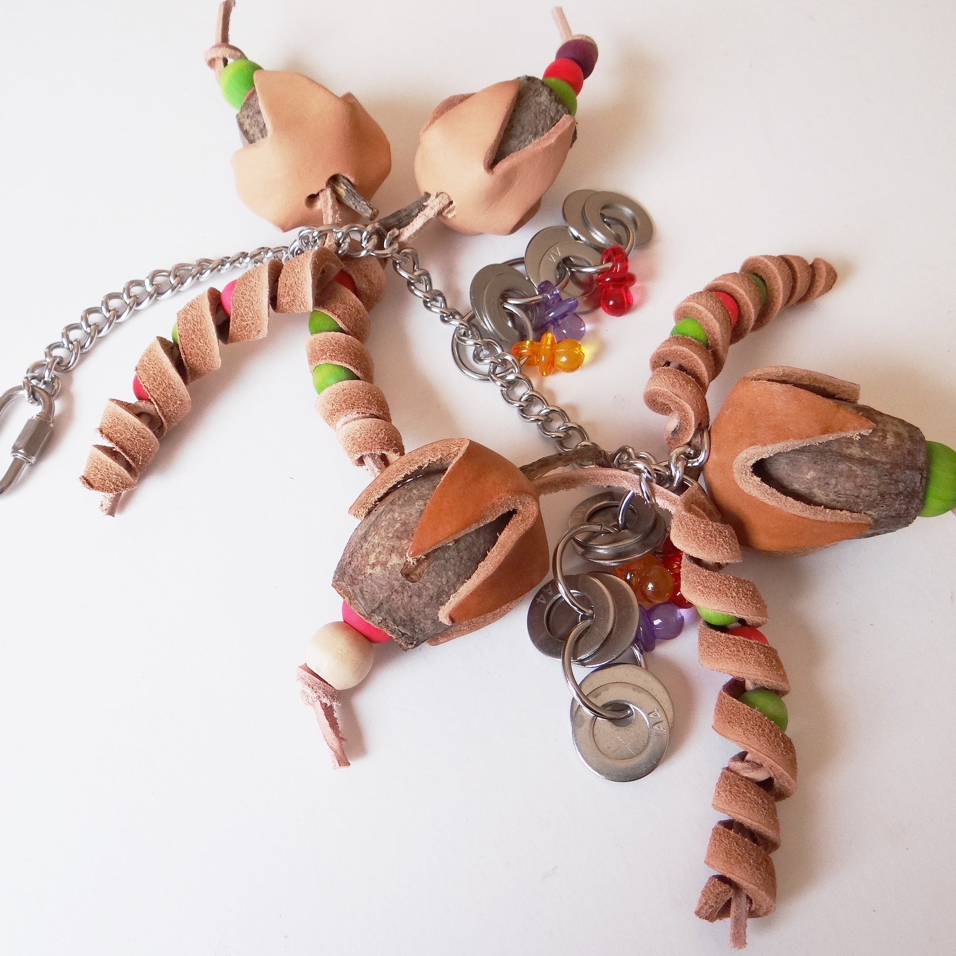 These Gumnuts are nice and big. Leather twist with hidden wooden beads and stainless steel washer with shinny pacifier will show entertain your parrot.