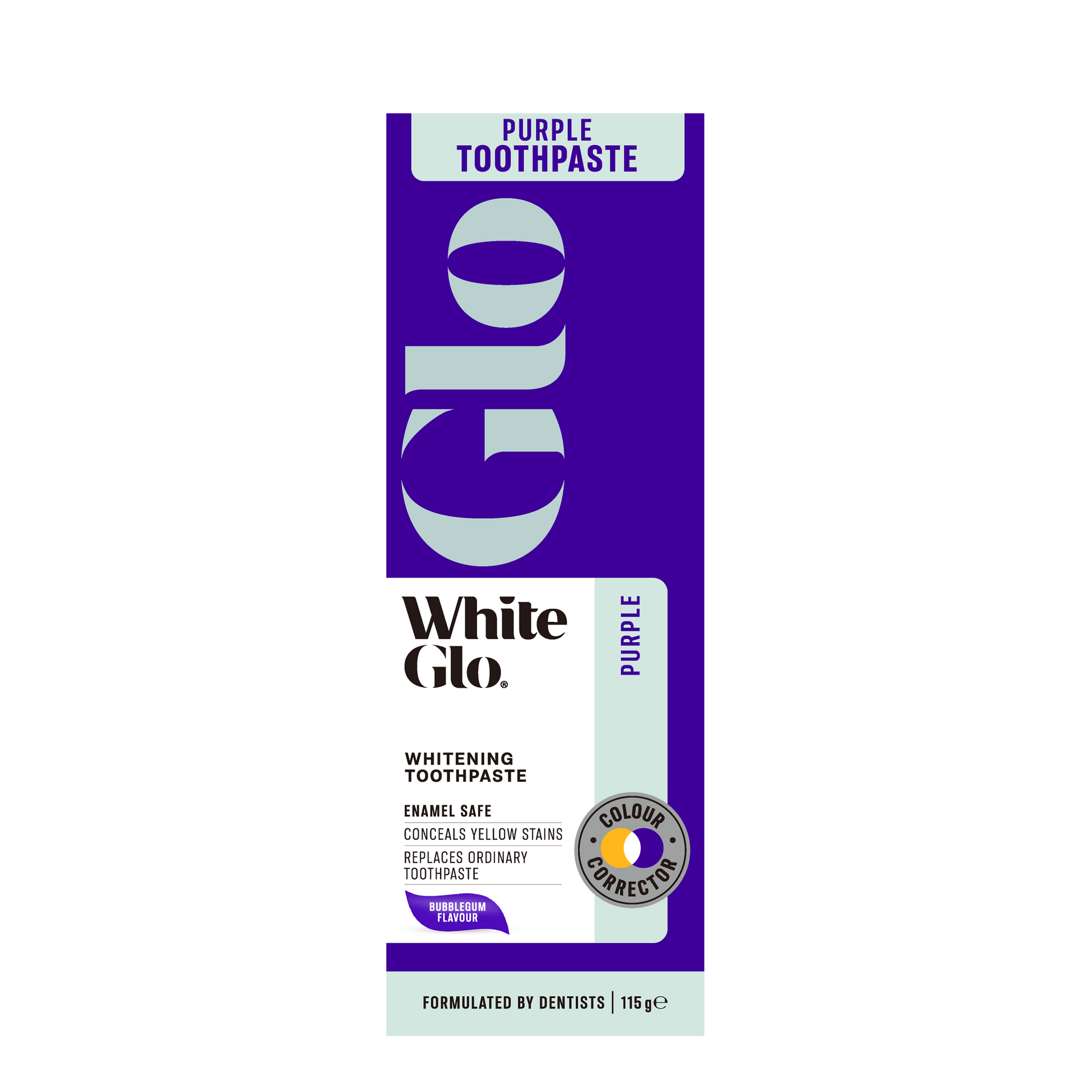 White Glo’s Purple Tooth Toner Technology features a specialised combination of red and blue dyes, to make purple colour correctors. These colour correctors instantly conceal yellow stains on teeth enamel. White Glo have developed this technology into a whitening toothpaste format, designed to be used daily.