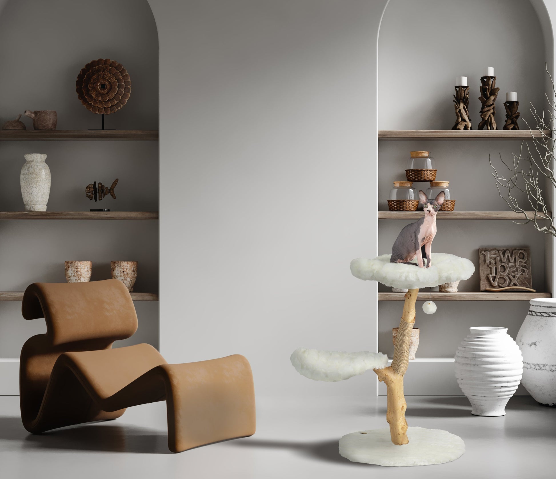 Description The KBSPETS Team is pleased to introduce you to our new Monochrome Collection! Featuring our Teddy Blanc + Teddy Noir. this collection introduces a new level of splendor to our luxury cat furniture. These products will turn your home into a piece of art. This modern floral design is hand-made with real natural. treated wood branches. one teddy blanc-designed flower cat bed. and one leaf design perch. It also has one dangly pom-pom toy attached for playtime fun.