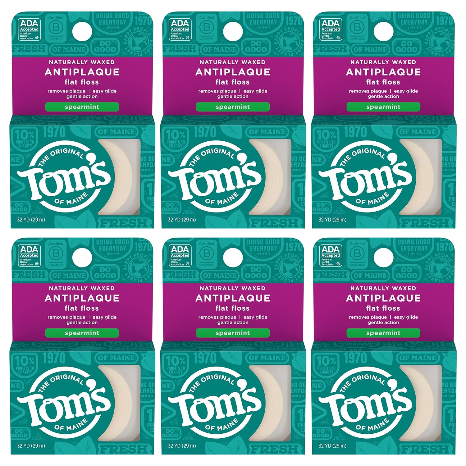 WHAT YOU'LL GET: Six 32-yard packs of Tom's of Maine Naturally Waxed Antiplaque Flat Floss in Spearmint Flavor